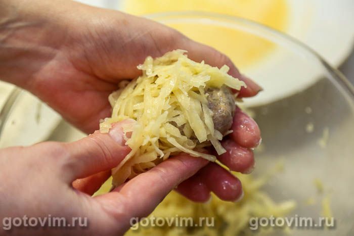 и облепить со всех сторон, плотно прижимая руками, тертым картофелем.