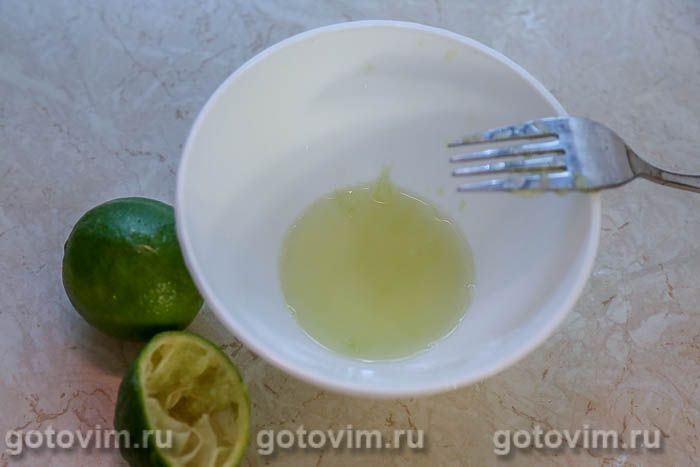 Лаймы вымыть, обтереть досуха бумажными полотенцами и выдавить сок. Можно сделать это с помощью соковыжималки для цитрусовых или воспользоваться обычной вилкой. Её надо воткнуть в мякоть лаймовой половинки и провернуть, чтобы вышел сок.