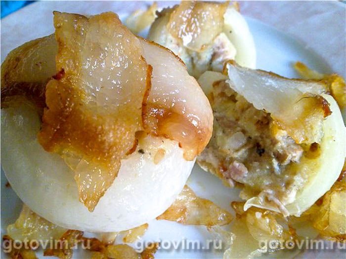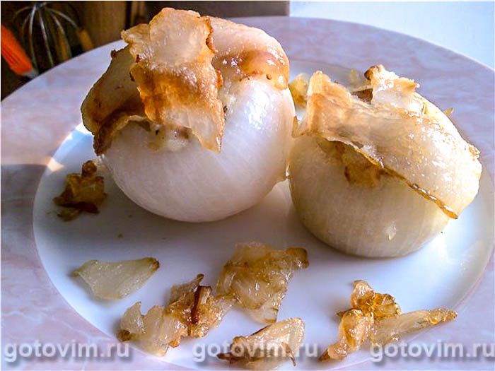 Фаршированный лук готовят разными способами. В этом рецепте предлагают луковицы вначале немного проварить, а затем, освободив сердцевину, наполнить готовой пшенной кашей с мясом и грибами и накрыть полосками сала. Запекать до тех пор, пока сало не превратится в шкварки.