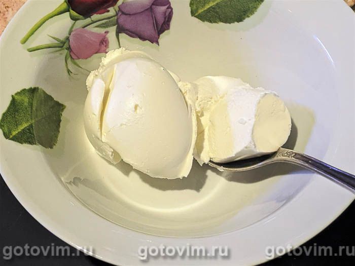 На сливочный сыр выкладываем вишнёвую массу. Готовим её так: вишню провариваем, протираем через сито, добавляем 4 ложки сахара и столовую ложку крахмала. Увариваем до густоты и даём массе остыть.