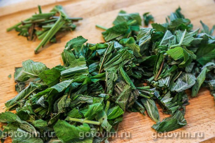 Пучок свежей мяты промыть под проточной водой, стряхнуть лишнюю влагу и положить на полотенце, чтобы зелень обсохла. После этого нарезать мяту, не отделяя листья от стеблей.