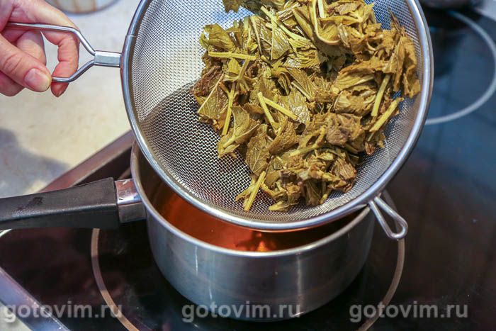 Дать мятному отвару настояться, хотя бы пока он не остынет при комнатной температуре. У нас кастрюлька с мятным отваром простояла ночь в холодильнике.