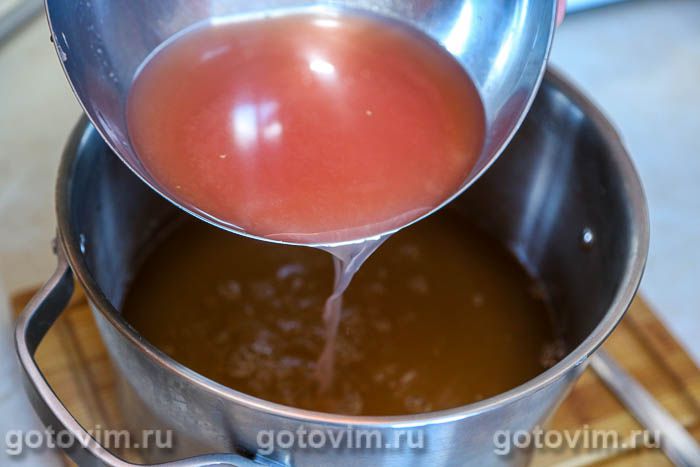 Слить получившийся отвар в кастрюлю через металлическое сито и дать ему слегка остыть.