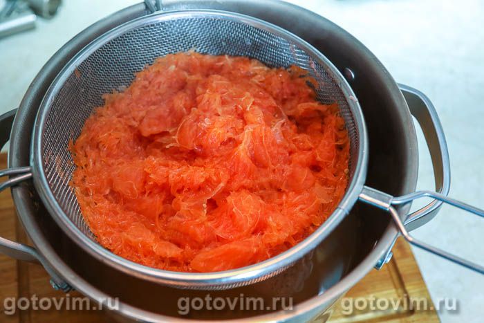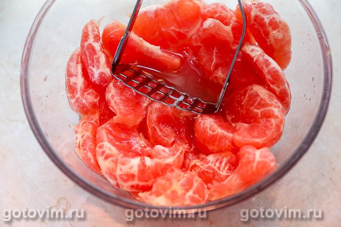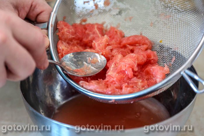 Очищенные дольки грейпфрута немного помять картофелемялкой (либо слегка пробить блендером), а затем отжать сок через металлическое сито над миской.