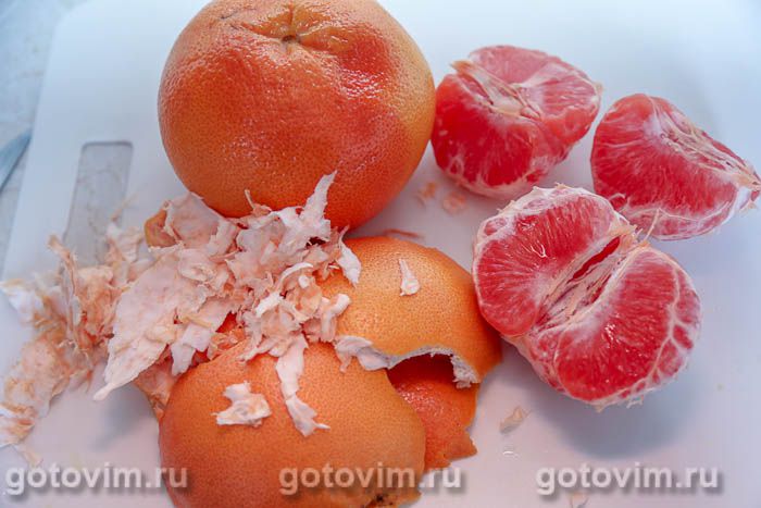 Очистить грейпфруты от кожуры, разделить на дольки и каждую дольку очистить от белых пленочек, насколько это возможно. Именно белые пленки дают горечь.