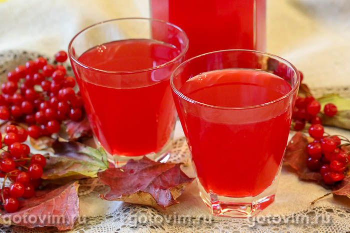Чтобы морс из калины получился по-настоящему целебным, ягоды не надо варить. Калину протирают через сито, собирают сок, а оставшийся жмых из шкурок и косточек заливают водой и слегка проваривают. Вот этой жидкостью разбавляют калиновый сок и больше ничего не варят. Морс уже готов! Сахар или мёд добавляйте по своему вкусу.
