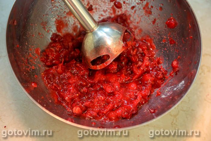Клюкву слегка пюрировать. Удобнее сделать это погружным блендером.