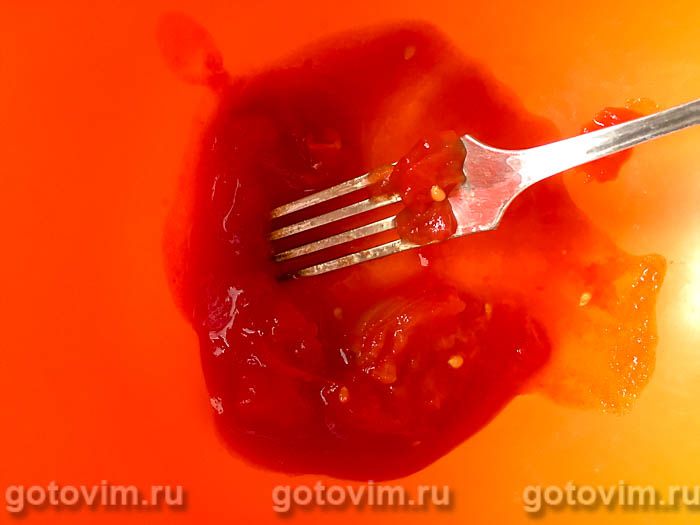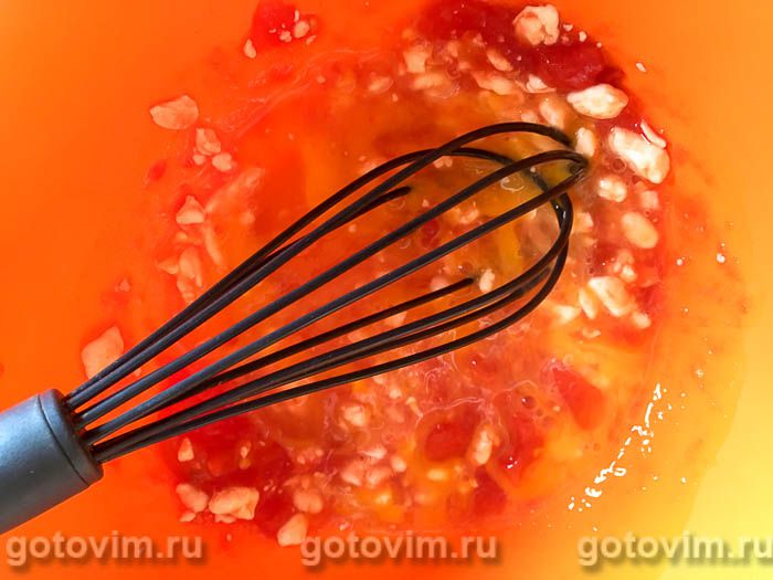 В миску небольшого размера, в котором будете замешивать продукты для омлета, выжать мякоть с соком из надрезанного спелого помидора.