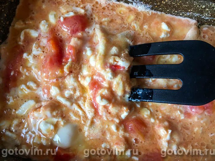 Всыпать к помидорам зерновой творог и влить яйца.