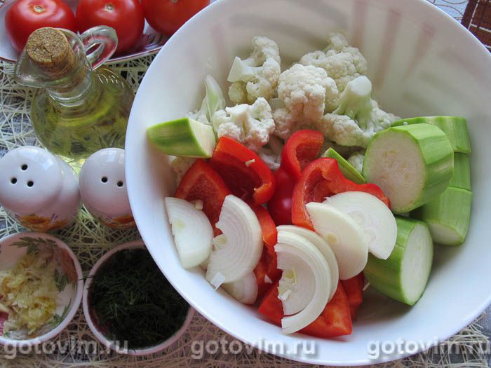 Как запечь овощи в духовке. Очистите все овощи (от кожуры, семян и плодоножек) и вместе зеленью тщательно вымойте. Молодые тонкошкурые кабачки можно не чистить. Капусту, разумеется, разберите на маленькие соцветия. Разложите промытые овощи на полотенце, чтобы удалить лишнюю влагу.