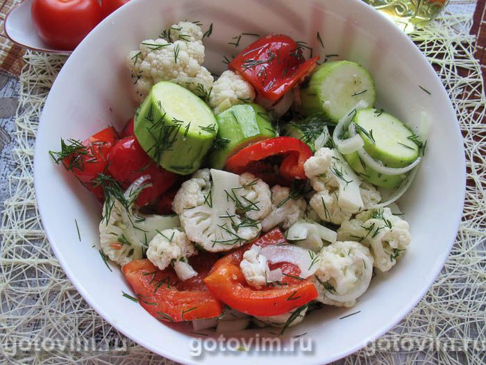 Овощную нарезку сложите в большую миску, а измельченный укроп вместе с чесноком смешайте со специями и растительным маслом.
