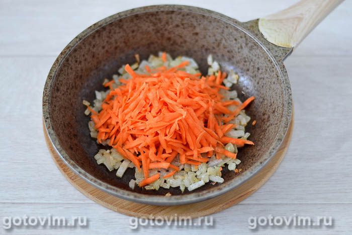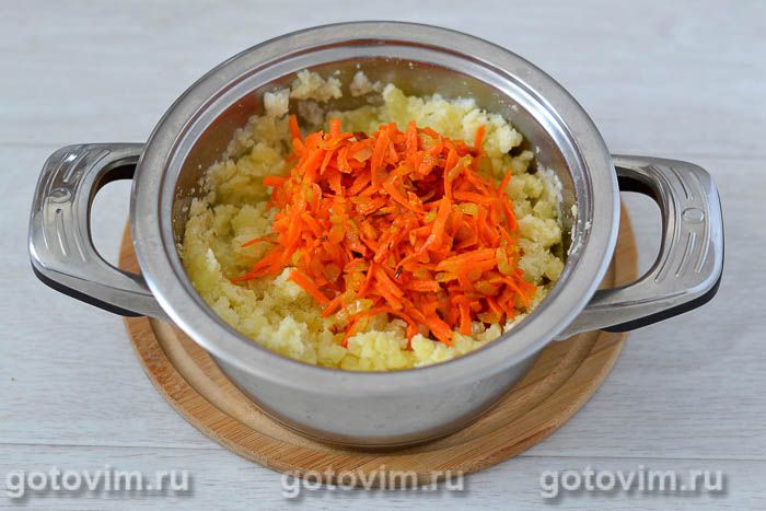 Пока варятся капуста и картофель, лук с чесноком очистить, мелко нарезать. Выкладывать лук с чесноком на разогретую сковороду с растительным маслом и обжаривать, помешивая, до прозрачности лука. Добавить к луку очищенную, натертую на крупной тёрке морковь. Перемешивая, пассеровать овощи 2-3 минуты.