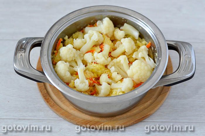 Добавить бланшированные цельные соцветия цветной капусты, аккуратно перемешать