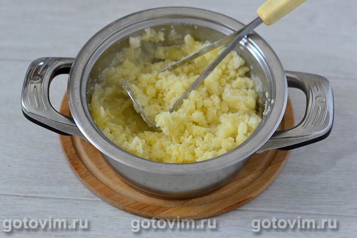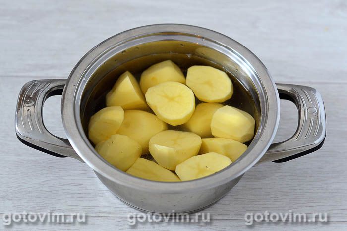 К этому времени картофель будет готов. Слить с него воду и сразу размять в пюре.
