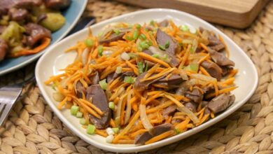 Накрыть следующим печеночным блином и снова распределить начинку. Повторять слои, пока не закончатся печеночные блины и овощная начинка. Убрать печеночный торт в холодильник на несколько часов или на ночь, чтобы слои пропитались начинкой, стали сочнее и вкуснее