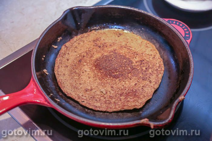 На смазанную растительным маслом сковороду диаметром 20-24 см наливать маленьким ковшиком порцию печеночного теста и равномерно распределять по сковороде. Как только верх печеночного блинчика подсохнет, перевернуть его и жарить с другой стороны. Использовать все тесто для жарки блинов из печени, при каждой новой порции теста смазывая сковороду растительным маслом. Основа для печеночного торта готова.