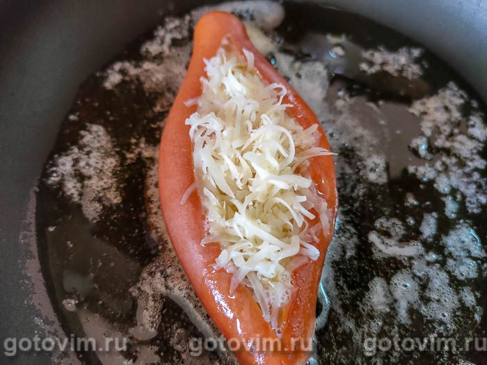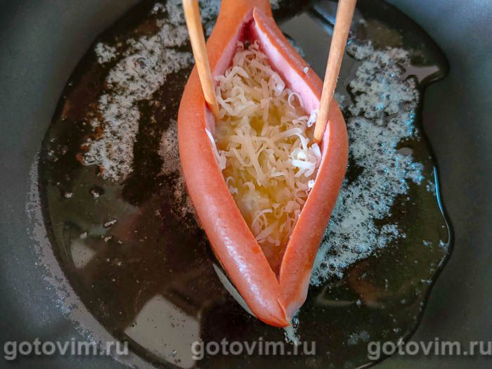 На сковороду налить немного растительного масла, добавить кусочек сливочного и дать маслу прогреться. Положить сосиску на сковороду, раздвинуть её по центру в обе стороны, используя деревянные шпажки.