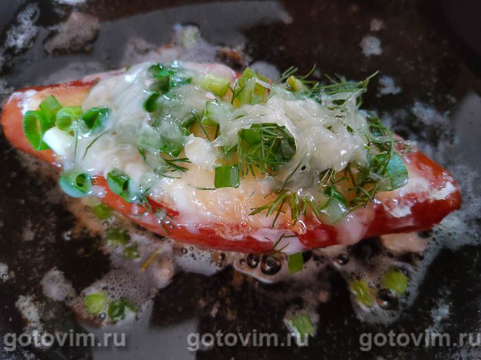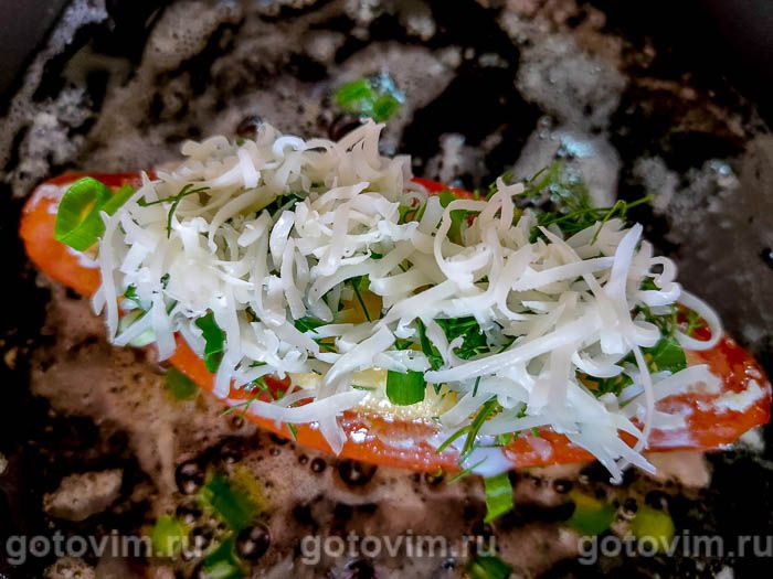 Когда сыр слегка расплавится, вылить поверх него яйцо. Посолить, приправить черным перцем.
