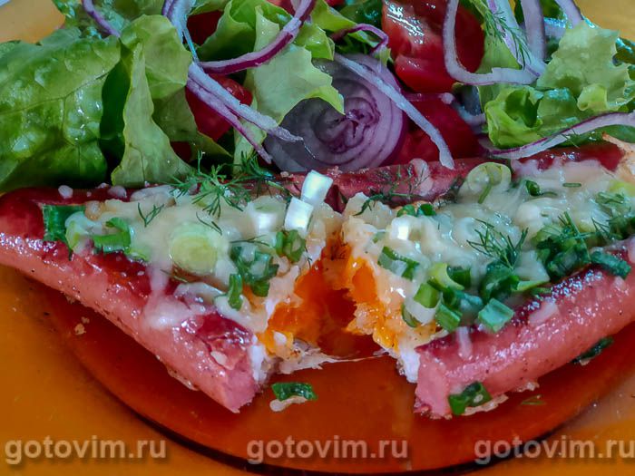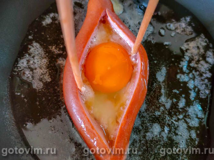 Перевернутая яичница глазунья, жаренная в сосиске с сыром . Рецепт с фото