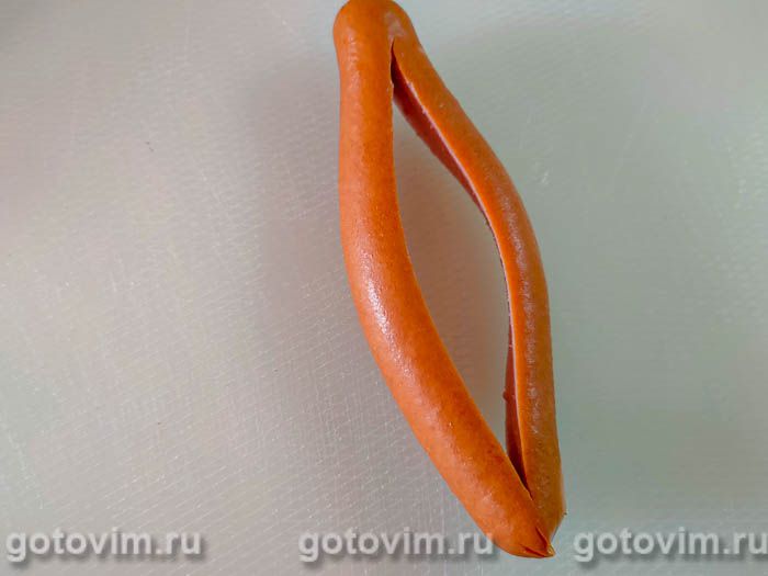 Разрезать сосиску вдоль по всей длине не доходя до краёв.