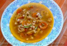 Залить мясо с овощами холодной водой или мясным бульоном. Как только жидкость закипит, прикрыть кастрюлю крышкой и томить на слабом огне примерно 30 минут.