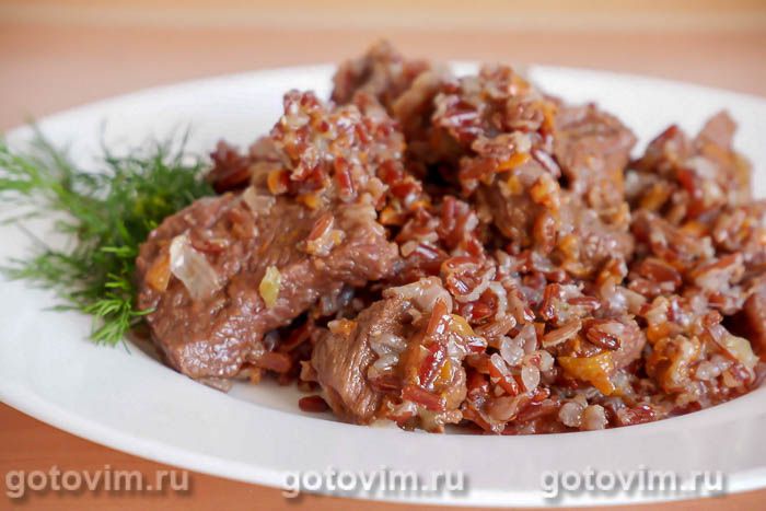 Через час вкусный и ароматный плов из красного риса с говядиной готов. Остается только перемешать его, разложить по тарелкам и подать на стол. Приятного аппетита!