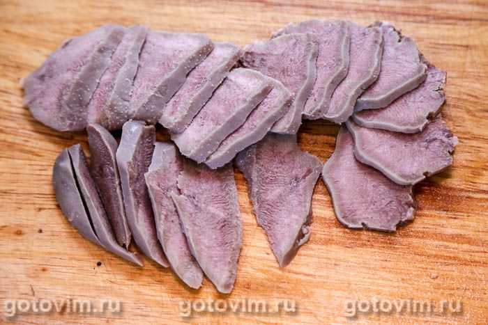 Открыть банку печени трески, слить жир из банки. Печень трески разрезать на кусочки и положить в салат.