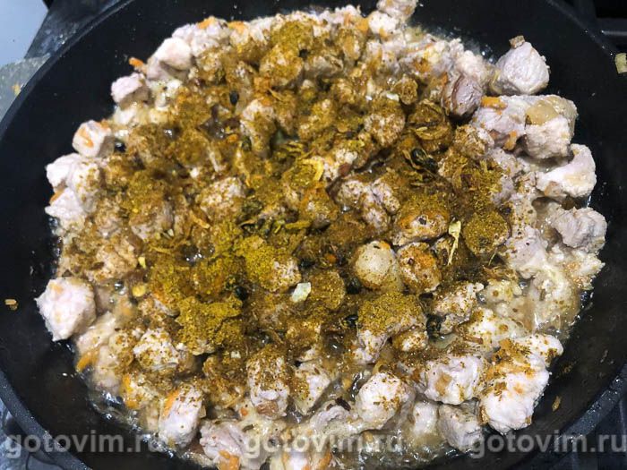 Приправить смесью пряностей для плова, посолить, хорошо перемешать и продолжать готовить примерно 10 минут на небольшом огне.