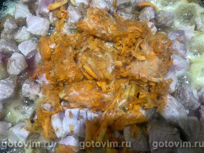 Лук очистить и нарезать. Очищенную морковь натереть на крупной терке или нарезать соломкой. Можно использовать терку для корейской моркови. Мясо промыть, обсушить и нарезать кубиками примерно 3х3 см.