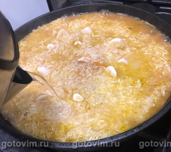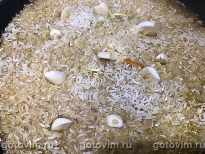 Засыпать рис, распределить его равномерно. Воткнуть в рис очищенные зубчики чеснока.