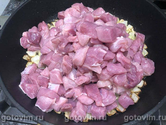 Переложить в сковороду кусочки мяса. Подойдут не только традиционные для плова баранина или говядина, но и свинина, курица или индейка.