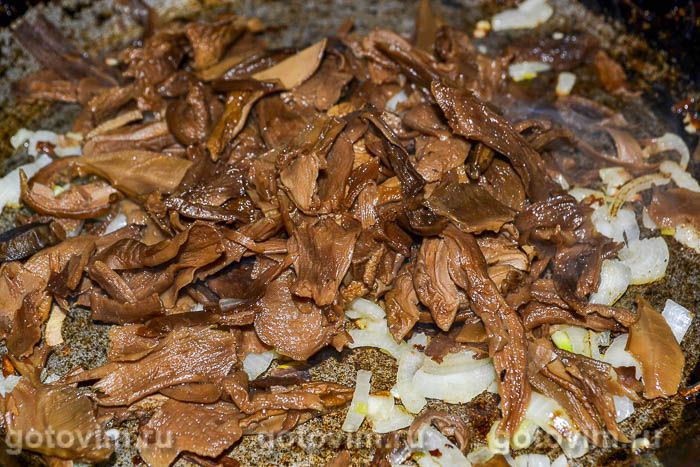 Достаньте грибы из отвара и добавьте в сковороду к луку. Грибной отвар пригодится в дальнейшем для тушения. Перемешайте грибы с луком и тушите несколько минут.