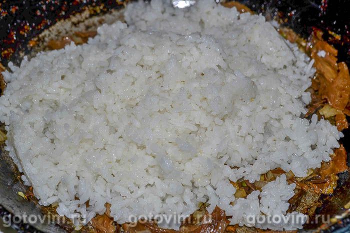 Рис, сваренный до полуготовности, добавьте в сковороду.