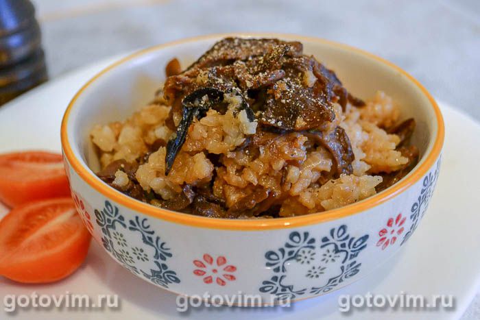 Влейте грибной отвар, перемешайте, закройте крышку и варите до готовности риса. Полезная рисовая каша с грибами готова. Специи в этом блюде будут излишними, так как грибы и так ароматные. Посыпьте кашу черным перцем и подавайте к столу, пока она горячая. Приятного аппетита!