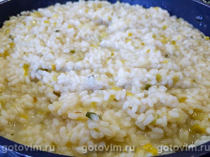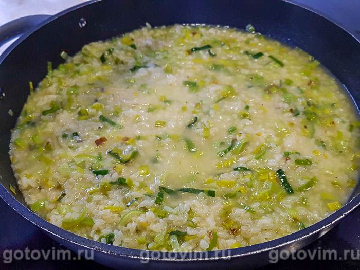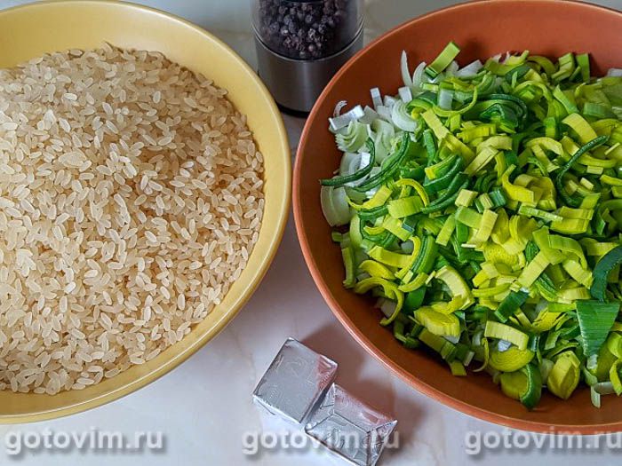 Ризотто готовить совсем не сложно, если выбрать нужный сорт риса и соблюдать правила. Для этого блюда выбирают рис сорта арборио. Именно из него получается ризотто кремообразной консистенции. Лук-порей (белую и частично зеленую часть стебля) нарезают довольно мелко, чтобы он практически растворился в готовом ризотто.