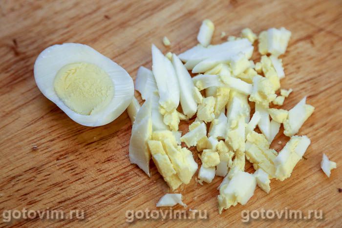 Сваренные вкрутую яйца очистить и мелко порубить. Отправить их в салатник.