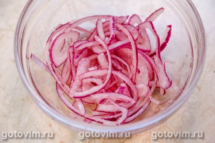 Затем переложить лук в миску, сбрызнуть уксусом. Перемешать и дать настояться в холодильники примерно 1 час.