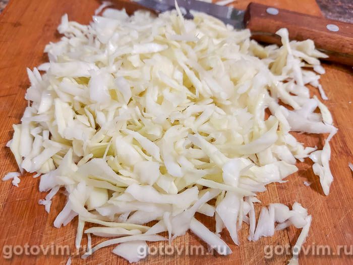 Пекинскую капусту вымыть, обсушить на бумажных полотенцах и нашинковать. Её можно заменить обычной белокочанной, но в этом случае надо её тоньше нашинковать.