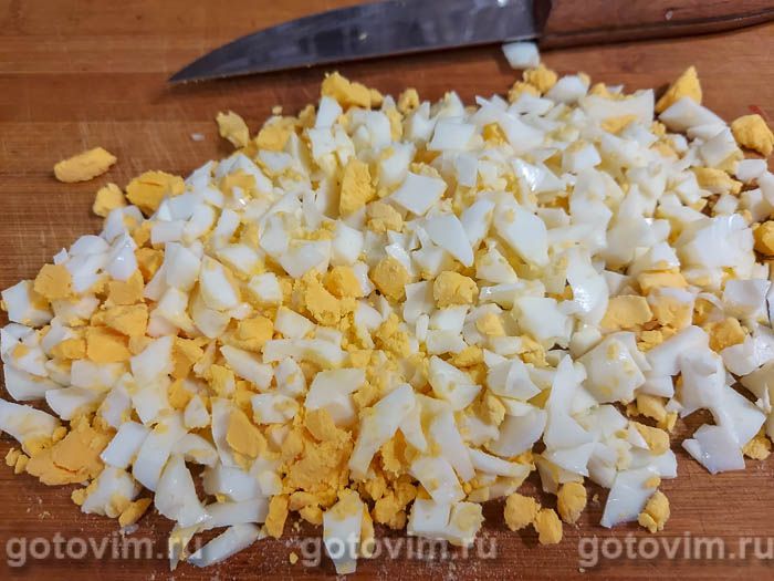 Сварить яйца вкрутую, остудить, очистить и мелко нарезать.