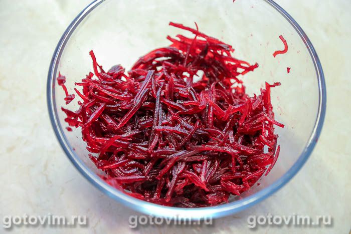 Сначала приготовить маринованную свеклу. Как это сделать описано в этом рецепте. Если коротко, то свеклу вымыть, сварить или запечь до готовности, после очистить и нарезать соломкой или натереть на терке для корейской моркови.