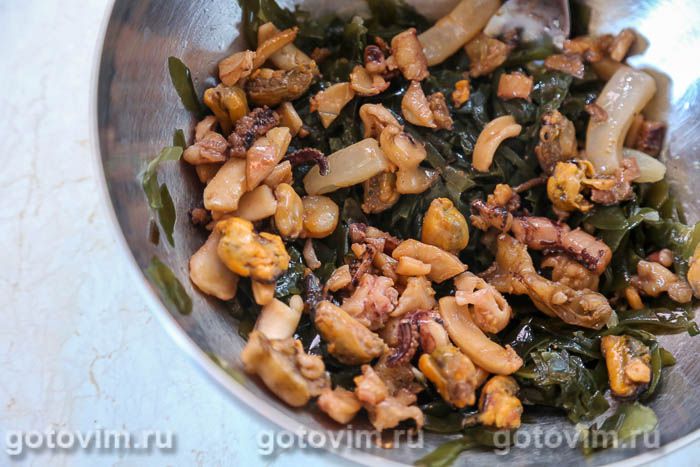 Положить в ароматизированное чесночное масло подготовленный морской коктейль и обжаривать, часто помешивая, пока не испарится жидкость. Снять сковороду с плиты, переложить морской коктейль на тарелку и дать ему остыть.