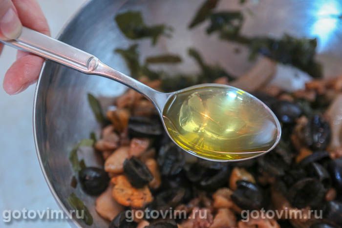 Прибавить нарезанный кружочками или просто половинками маслины. Посолить, поперчить по вкусу.