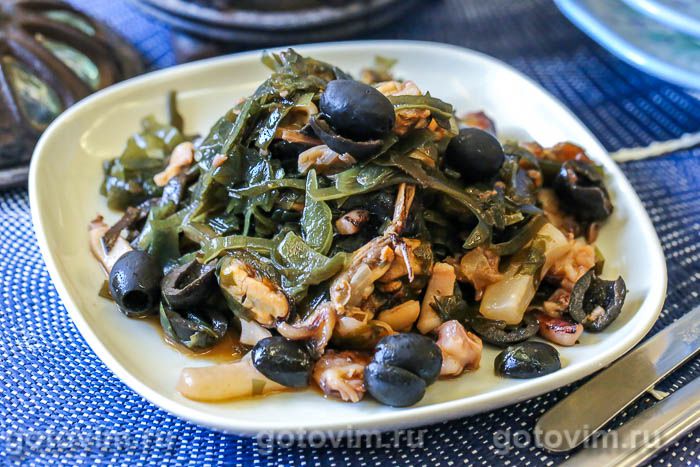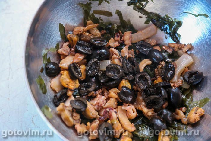 Приправить салат соком дольки лимона и растительным маслом. Хорошо перемешать и можно подавать к столу. Салат из морского коктейля с морской капустой и маслинами готов. Приятного аппетита!
