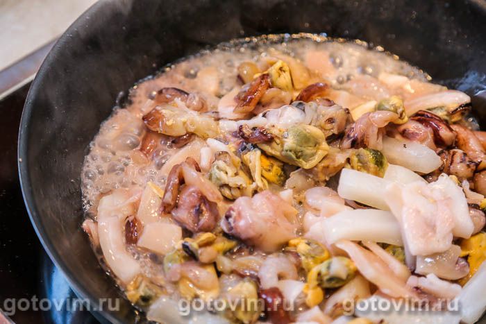 Морской коктейль предварительно разморозить, промыть, откинуть на дуршлаг и дать воде полностью стечь. Можно дополнительно обсушить морепродукты на бумажном полотенце. Конечно, перед обжаркой морепродукты можно и не размораживать, но тогда придется дольше доводить их до готовности уже на сковороде, дожидаясь, когда испарится малоаппетитная пена.