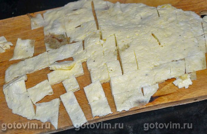 Готовый омлет переложить на тарелку, дать ему остыть, а затем нарезать небольшими кусочками.