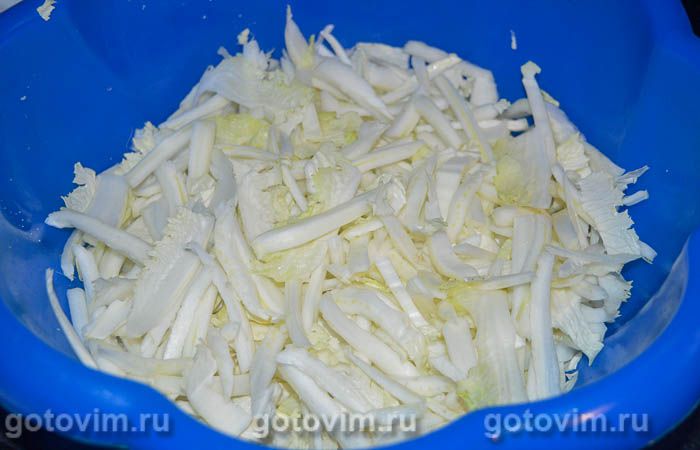Пекинскую капусту сполоснуть под проточной холодной водой, обсушить на бумажных полотенцах и нарезать соломкой. Нарезанную капусту посолить и слегка помять руками.