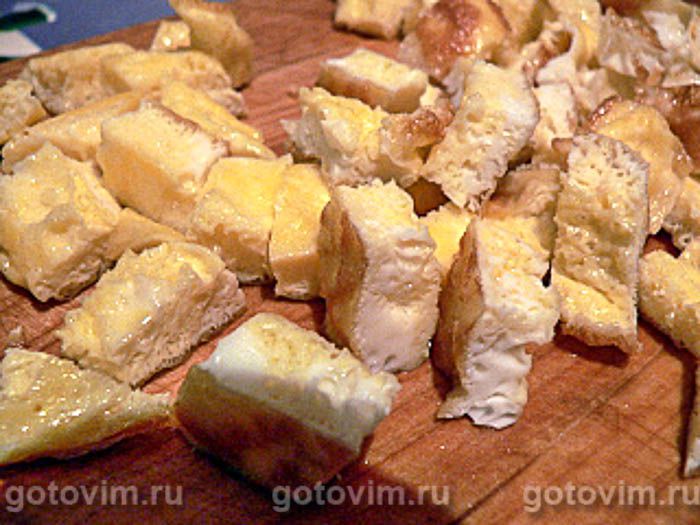Омлет переложите на доску. Порежьте небольшими кубиками.
