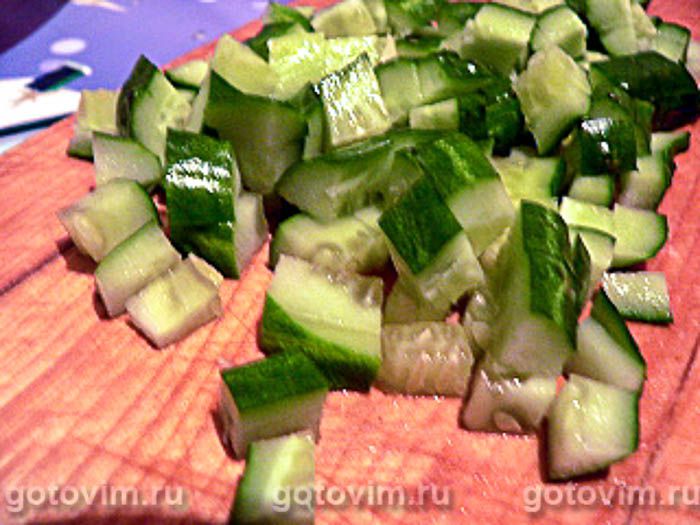 Такими же кубиками порежьте свежий огурец. Посолите, добавьте 2 ст.л. растительного масла.