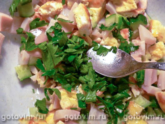 Листья петрушки мелко порубите, и добавьте к салату.