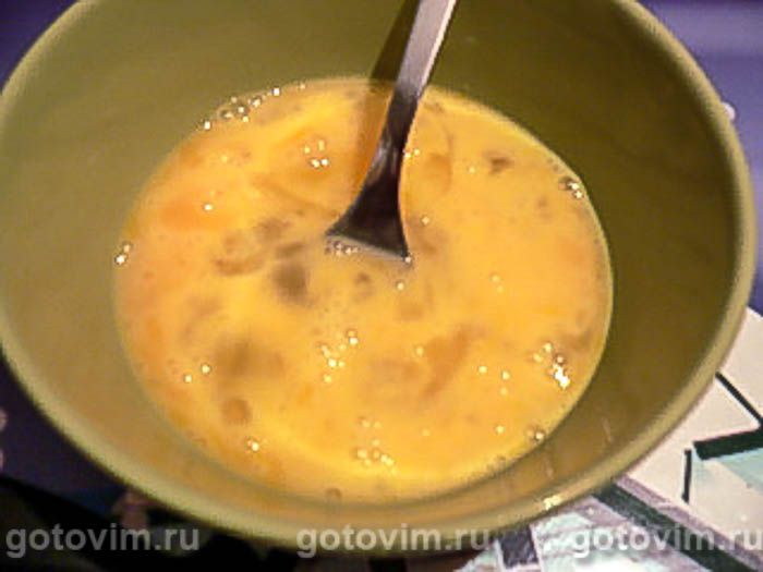 Два яйца выбейте в мисочку. Размешайте вилкой.